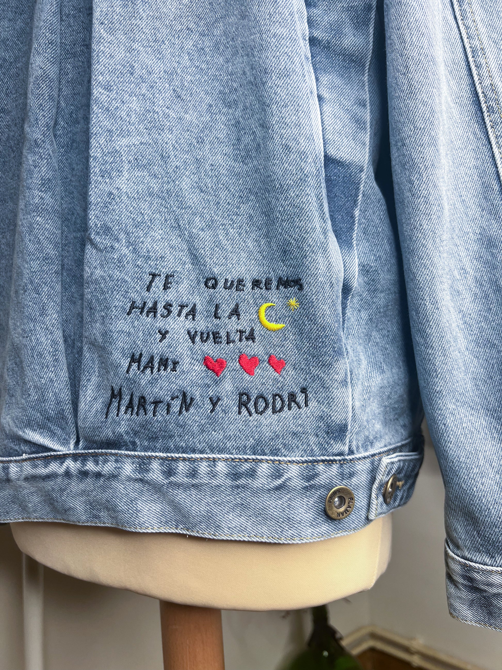 Cada chaqueta se crea de forma individual. Primero, nos cuentas tu idea, historia o a quién va destinada. A partir de ahí, diseñamos juntas el bordado y el forro para que refleje ese mensaje especial. Todo se realiza en nuestro taller en Asturias, con mucho mimo.